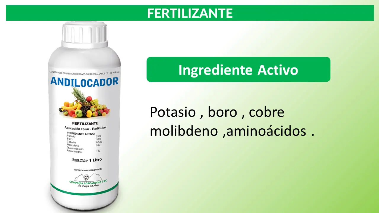 Es un producto concentrado soluble con alto contenido de POTASIO (K), especialmente formulado para traslocar y trasladar la energía del follaje y ramas hacia los frutos y órganos fruteros subterráneos (tubérculos, liliáceas, espárragos etc.) para ayudarlos a mejorar y uniformizar la maduración (traslocación de los Fotosintatos a los frutos y/o tubérculos).
